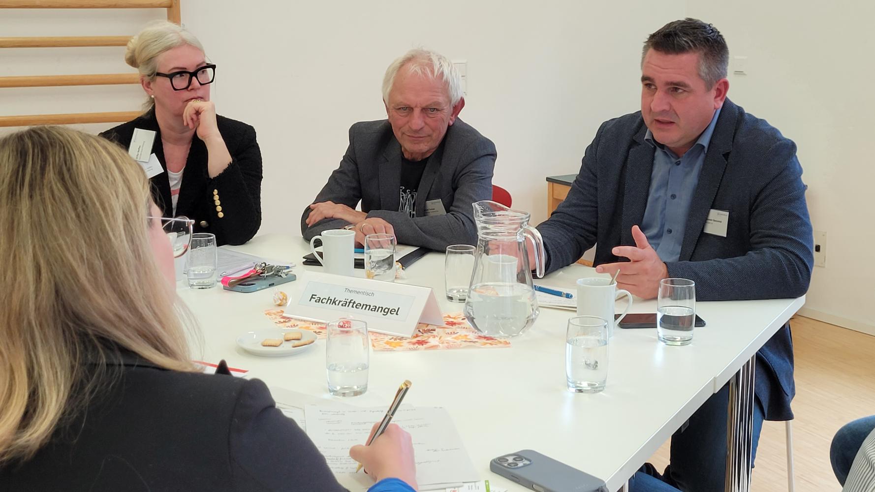 Vom Thementisch Fachkräftemangel berichtet Alexander Oberschmid: "Fachkräftemangel bedeutet mehr Arbeit für die Belegschaft. Die Anerkennung der Berufsabschlüsse von Fachkräften mit Migrationshintergrund ist nach wie vor langwierig. In den ländlichen Regionen ist oft der geringe Ausbau des ÖPNV ein Thema, ohne diesen und ohne Auto gibt es keinen Zugang zu Arbeitsplätzen. In Ballungsräumen ist der geringe Wohnraum und die hohen Mieten bei gleichzeitig geringen Löhnen und Gehältern im sozialen Bereich ein Thema. Außerdem der Anspruch auf die Work-Liefe Balance." Hieraus zog die Gruppe die Schlussfolgerung: "Ein verpflichtendes soziales Jahr für alle jungen Menschen wäre gut. Für einige könnte das einen Zugang zu sozialen Berufen bedeuten. Die Möglichkeiten, nach dem Renteneintritt weiterzuarbeiten sollten weiter ausgebaut werden."