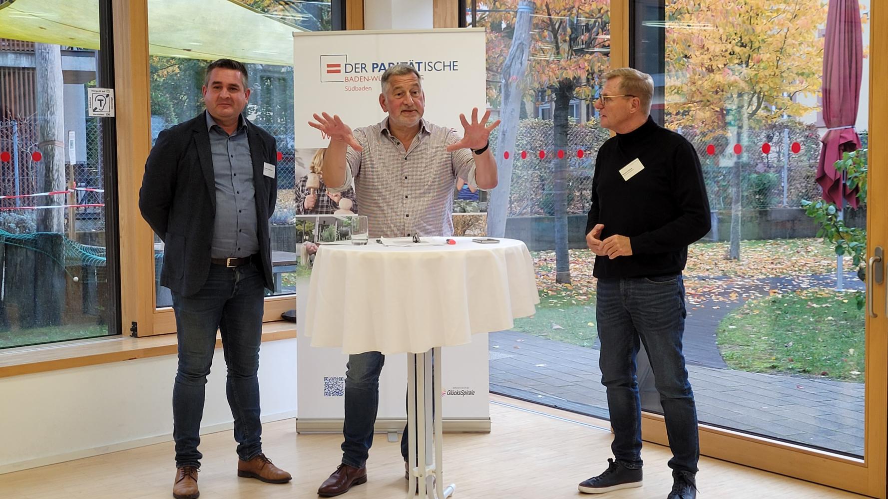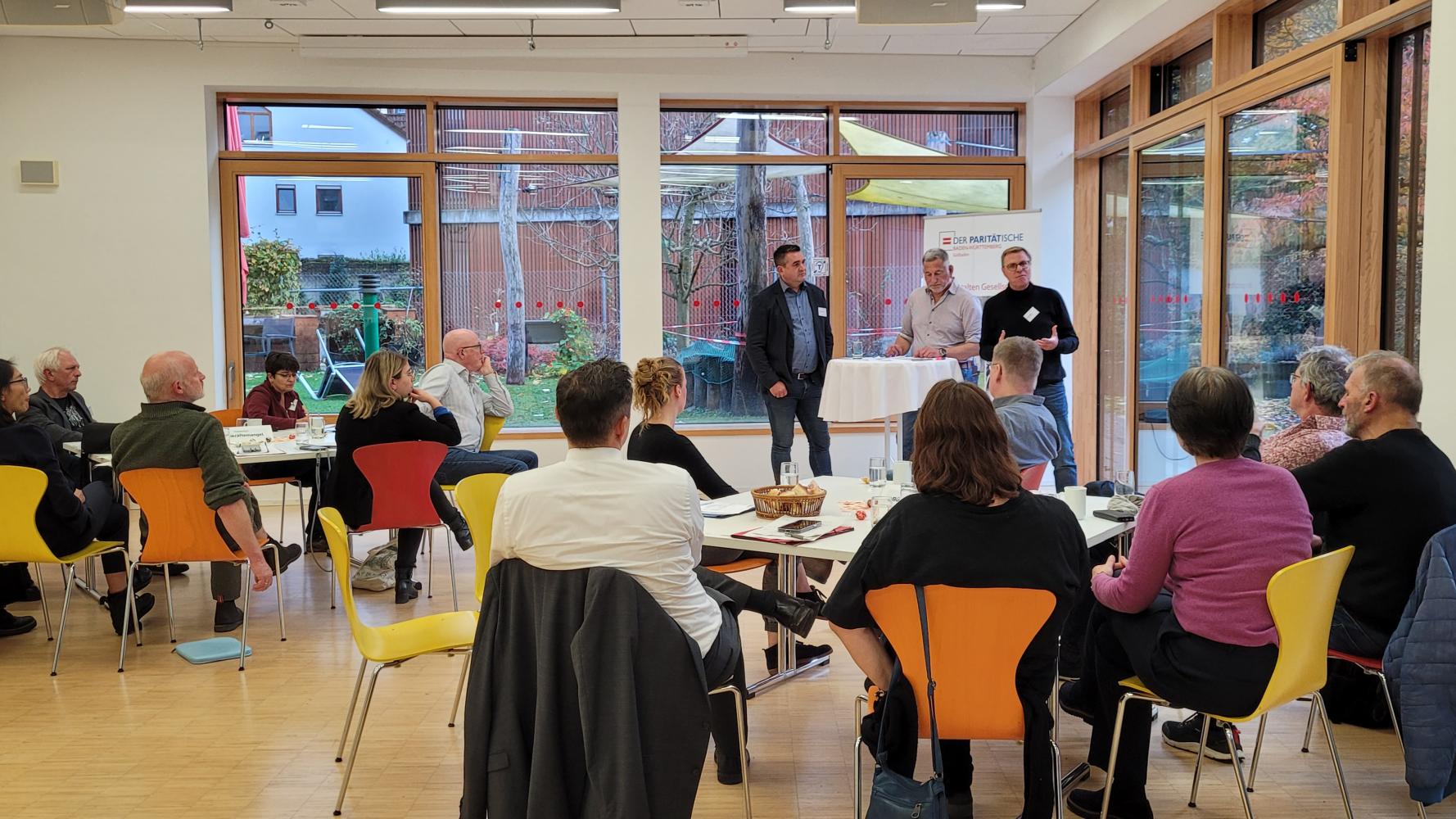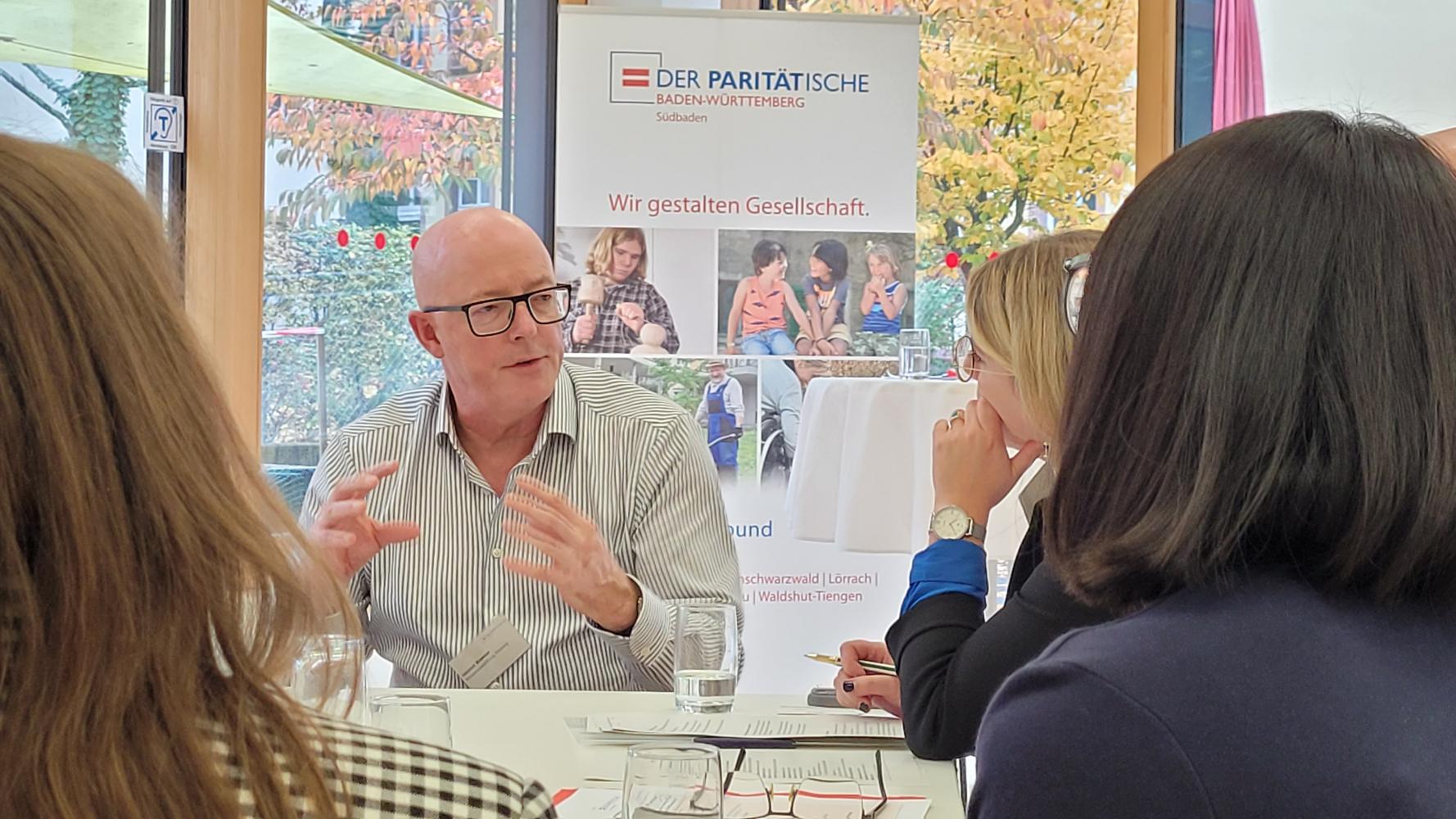 Konkret wurde an zwei Thementischen zu den Unterpunkten Fachkräftemangel und Bürokratisierung diskutiert. Die Themenpaten Alexander Oberschmid, Geschäftsführer CHRISTIANI e. V. und Vorstandsvorsitzender des Paritätischen Kreisverbands Waldshut-Tiengen, und Norbert Köthnig, Geschäftsführer der Lebenshilfe Breisgau gGmbH und Vorstandsvorsitzender des Paritätischen Kreisverbands Emmendingen, moderierten ihre Gruppen und gaben im Anschluss im Plenum weiter, was besprochen wurde.