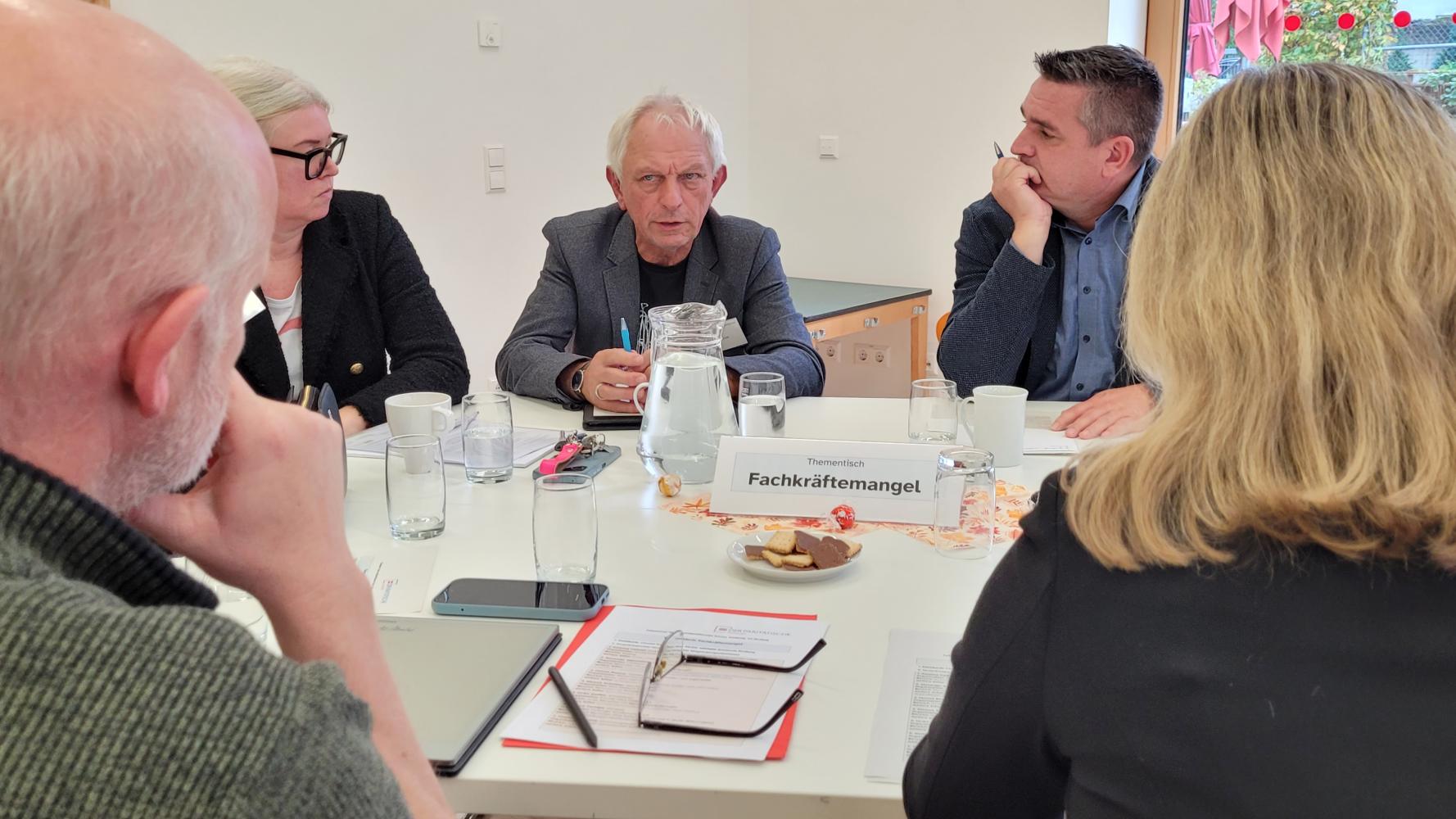 Vom Thementisch Fachkräftemangel berichtet Alexander Oberschmid: "Fachkräftemangel bedeutet mehr Arbeit für die Belegschaft. Die Anerkennung der Berufsabschlüsse von Fachkräften mit Migrationshintergrund ist nach wie vor langwierig. In den ländlichen Regionen ist oft der geringe Ausbau des ÖPNV ein Thema, ohne diesen und ohne Auto gibt es keinen Zugang zu Arbeitsplätzen. In Ballungsräumen ist der geringe Wohnraum und die hohen Mieten bei gleichzeitig geringen Löhnen und Gehältern im sozialen Bereich ein Thema. Außerdem der Anspruch auf die Work-Liefe Balance." Hieraus zog die Gruppe die Schlussfolgerung: "Ein verpflichtendes soziales Jahr für alle jungen Menschen wäre gut. Für einige könnte das einen Zugang zu sozialen Berufen bedeuten. Die Möglichkeiten, nach dem Renteneintritt weiterzuarbeiten sollten weiter ausgebaut werden."